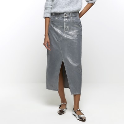 Grey coated denim midi skirt River Island